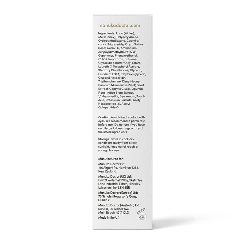 Aqua (Water), Mel (Honey), Polyacrylamide, Cyclopentasiloxane, Caprylic/capric Triglyceride, Oryza Sativa (Rice) Germ Oil, Ammonium Acryloyldimethyltaurate/VP Copolymer, Phenoxyethanol, C13-14 Isoparaffin, Butylene Glycol,Shea Butter Oleyl Esters, Laureth-7, Tocopheryl Acetate, Stearoxy Dimethicone, Glycerin, Disodium EDTA, Ethylhexylglycerin, Glucosyl Hesperidin, Triethanolamine, Dimethicone, Panicum Miliaceum (Millet) Seed Extract, Caprylyl Glycol, Opuntia Ficus-indica Stem Extract, 1,2-hexanediol, Bee Venom, Tannic Acid, Potassium Sorbate, Acetyl Hexapeptide-37, Acetyl Octapeptide-3