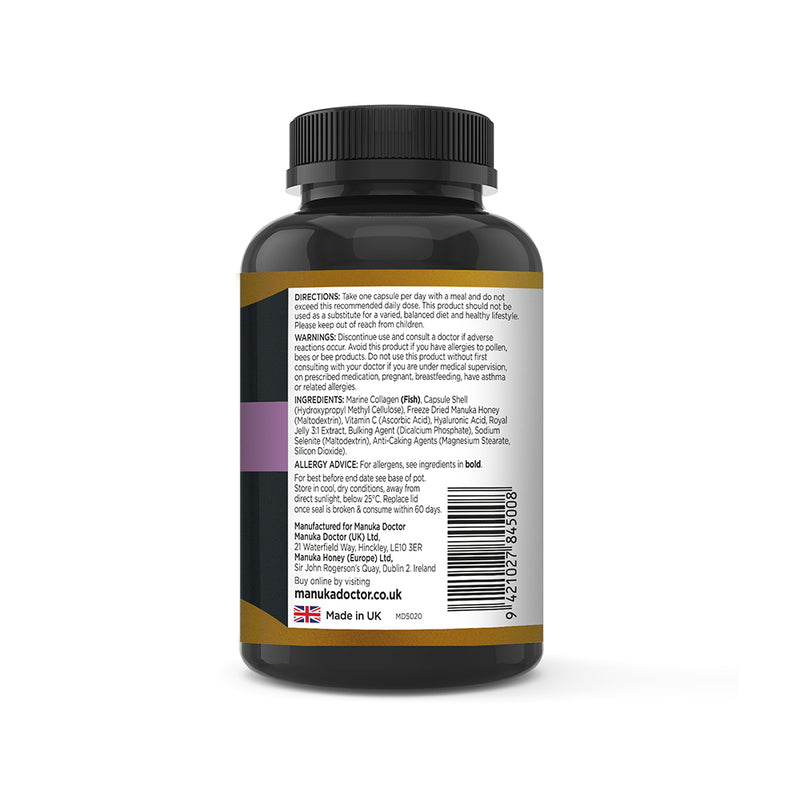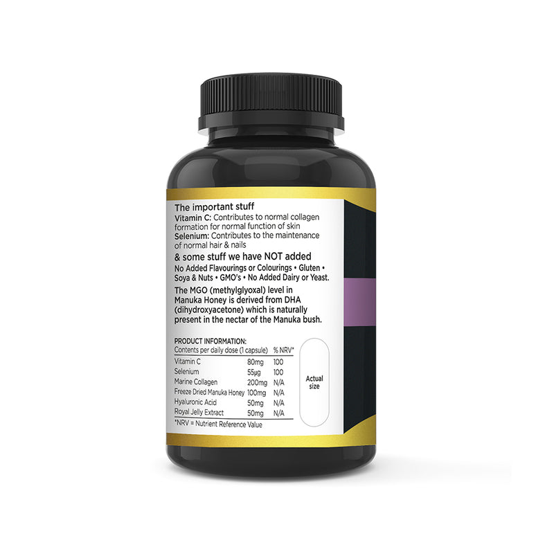 Marine Collagen (Fish), Capsule Shell (Hydroxypropyl Methyl Cellulose), Freeze Dried Manuka Honey (Maltodextrin), Vitamin C (Ascorbic Acid), Hyaluronic Acid, Royal Jelly 3:1 Extract, Bulking Agent (Dicalcium Phosphate), Sodium Selenite (Maltodextrin), Anti-Caking Agents (Magnesium Stearate, Silicon Dioxide).