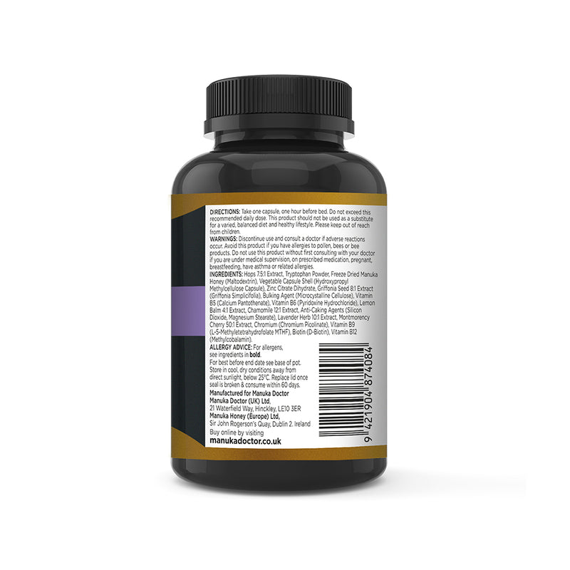 Hops 7.5:1 Extract, Tryptophan Powder, Freeze Dried Manuka Honey (Maltodextrin), Vegetable Capsule Shell (Hydroxypropyl Methylcellulose Capsule), Zinc Citrate Dihydrate, Griffonia Seed 8:1 Extract (Griffonia Simplicifolia), Bulking Agent (Microcystalline Cellulose), Vitamin B5 (Calcium Pantothenate), Vitamin B6 (Pyridoxine Hydrochloride), Lemon Balm 4:1 Extract, Chamomile 12:1 Extract, Anti-Caking Agents (Silicon Dioxide, Magnesium Stearate), Lavender Herb 10:1 Extract, Montmorency Cherry 50:1 Extract, Chromium (Chromium Picolinate), Vitamin B9 (L-5-Methyletetrahydrofolate MTHF), Biotin (D-Biotin), Vitamin B12 (Methylcobalamin).