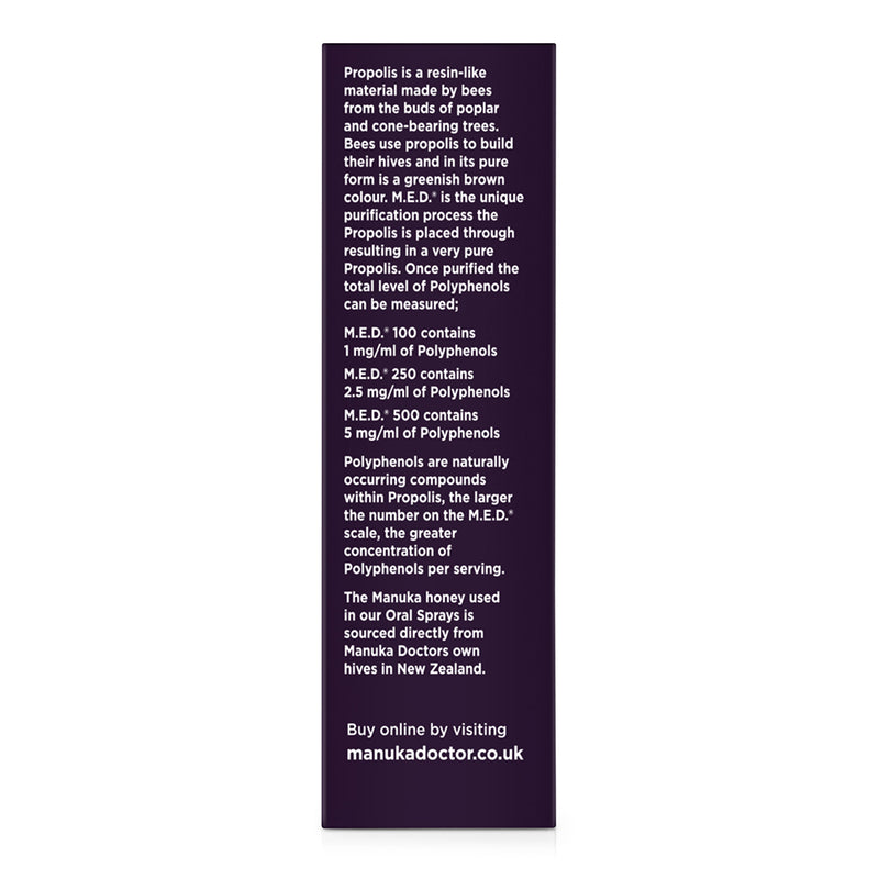 Polyphenols are naturally occurring compounds within Propolis, the larger the number on the M.E.D. scale, the greater the concentration of Polyphenols per serving.