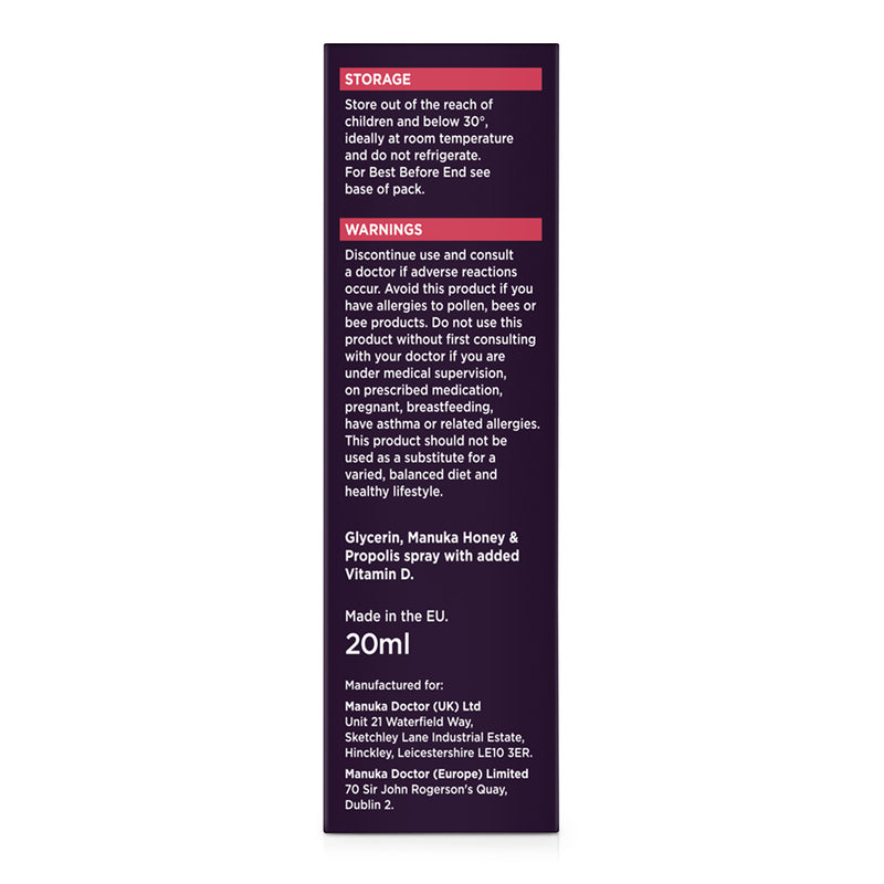 Water, Glycerin (34%), Manuka honey (10%), Propolis (10%), Preservative (Potassium sorbate), Vitamin D3 (cholecalciferol).