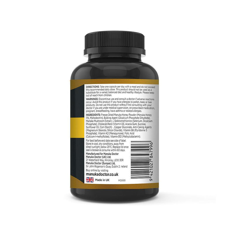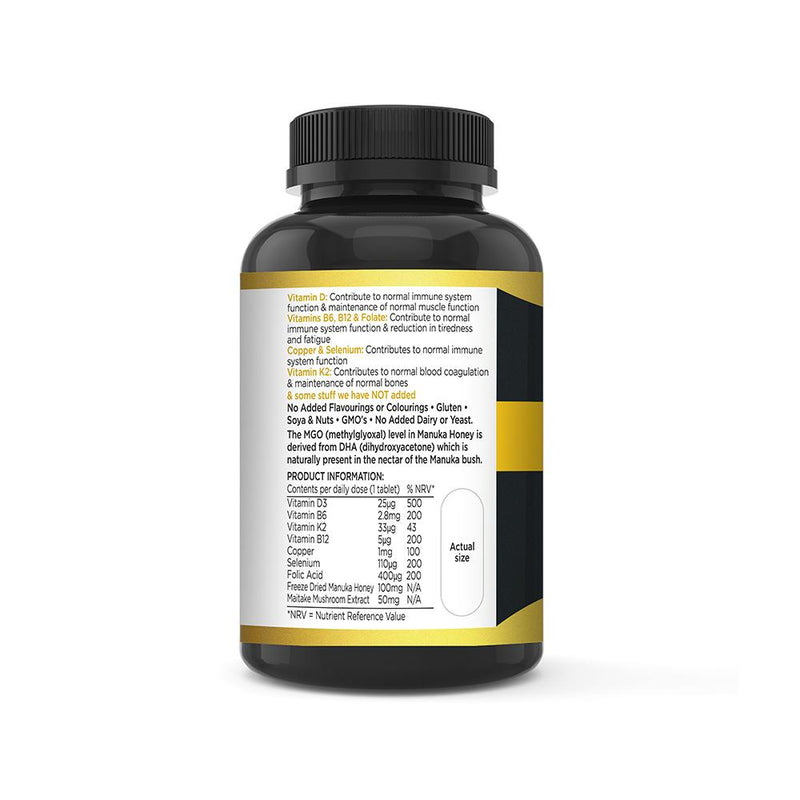 A daily food supplement for the maintenance and support of the immune system. Each capsule contains Vitamins D3, B6, B9, B12, K2, Folic Acid, Copper & Selenium combined with Freeze Dried Manuka Honey & Maitake Mushroom Extract.