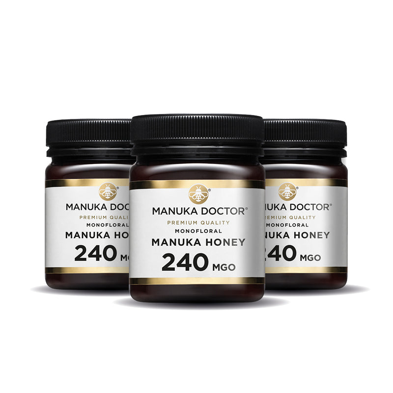 Trio Pack - 240 MGO Manuka Honey 250g Spoonful of Manuka Honey UK's number 1 brand of Manuka Honey 240 MGO Manuka Honey Review How does Manuka Honey taste Manuka Honey Benefits Manuka Honey MGO Ratings New Zealand Made Manuka Honey - Batch Test Certificates Pure Manuka Honey Genuine Manuka Honey Manuka Honey direct from the beekeeper Manuka Doctor 240 MGO Manuka Honey 250g - Tested & Certified as genuine Manuka Doctor 240 MGO Manuka Honey 250g - Nutritional Information