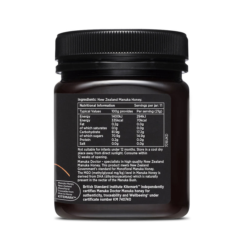 Manuka honey contains high levels of a key natural compound called Methylglyoxal (or MGO for short). MGO has special anti-bacterial properties, which means it can kill bad bugs and bacteria. It’s what sets Manuka apart from other honeys and makes it such a powerful choice for natural wellness. The higher the MGO number, the greater the concentration of this beneficial compound – and the stronger the honey’s activity. The amount of MGO contained is written on the front of every pot and is expressed as mg per kg. So a 100 MGO Manuka honey will contain at least 100 milligrams of Methylglyoxal per Kilogram.