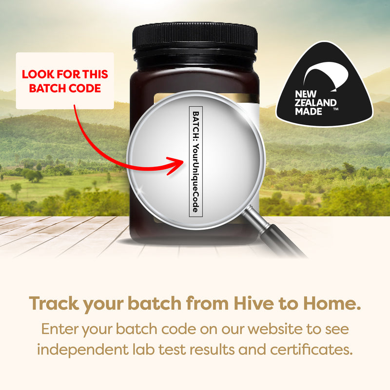 Ever jar of Manuka Doctor honey can be traced right back to the hives where it was created. Our Hive to Home guarantee means when we screw the lid on your jar in New Zealand, nobody opens it until you do. Before export, we test every batch to ensure it meets the strict New Zealand Government’s MPI standard. As well as a separate lab test to confirm the honey’s MGO level. You can see the results of these tests yourself too. Simply type the unique batch code printed on the side of your jar into our online checker to see the certificates for your batch.