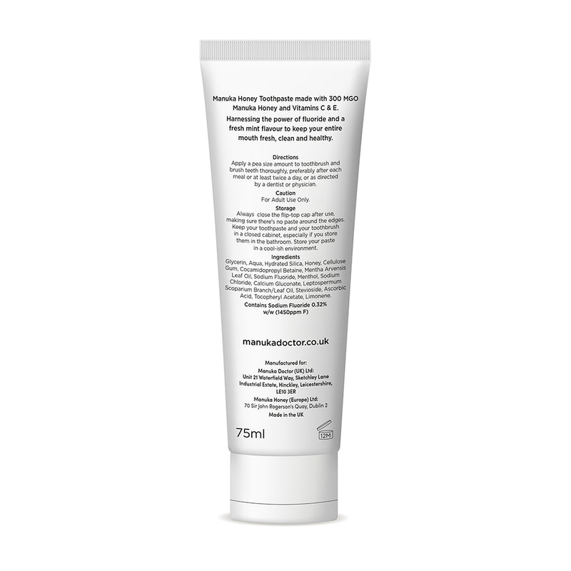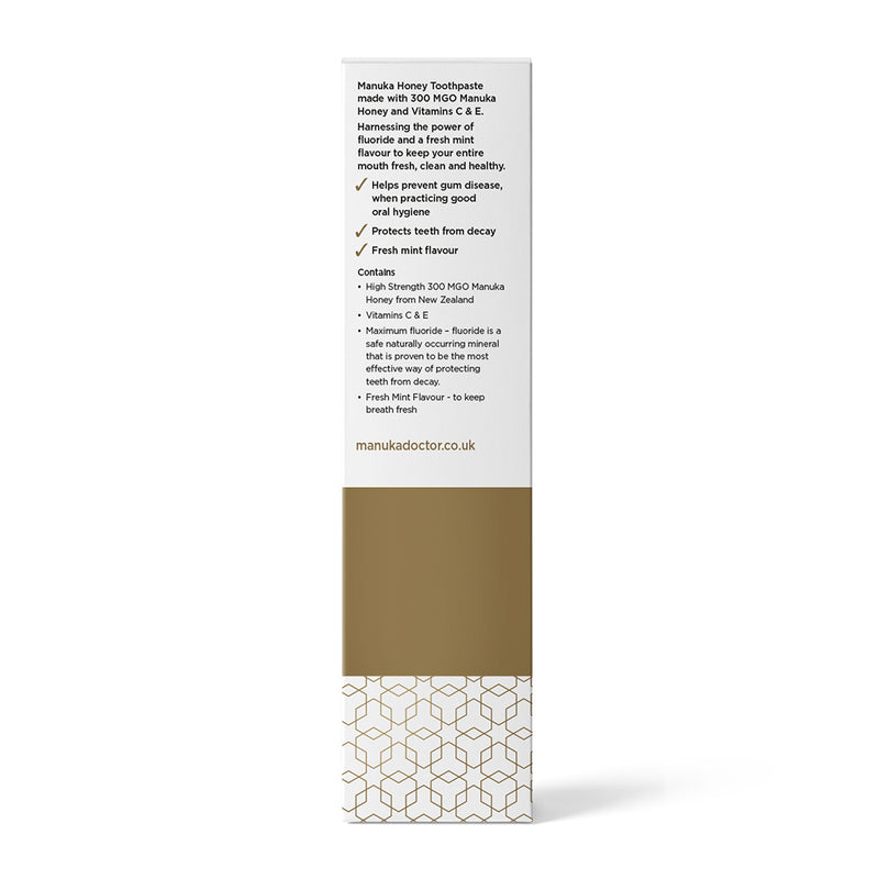 Manuka Honey Toothpaste made with high strength 300 MGO Manuka Honey from New Zealand, plus Vitamins C & E.