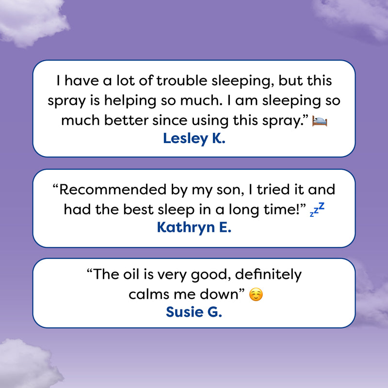 “I have a lot of trouble sleeping, but this spray is helping so much. I am sleeping so much better since using this spray.” Lesley K